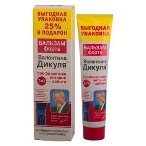 Бальзам Дикуля Форте поможет восстановлению двигательных функций при суставных травмах (ушибах, растяжениях, переломах), предотвратит развитие радикулита, остеохондрозов, артритов и артрозов и обеспечит успех комплексного лечения при запущенных формах этих заболеваний. Его высокая эффективность подтвердилась в ходе клинических испытаний в медицинских центрах Дикуля на больных с тяжелыми травмами и заболеваниями опорно-двигательного аппарата. Использование бальзама усиливает лимфо- и кровообращение, способствует активизации обмена веществ, образованию синовиальной (суставной) жидкости, выведению солевых отложений, регенерации хрящевой ткани, ускоряет рассасывание очага воспаления. Связочный аппарат и суставы приобретают большую подвижность.