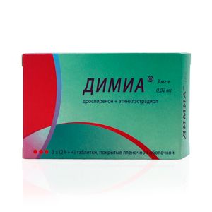 Показания к применениюПероральная контрацепция.Применение при беременности и кормлении грудьюПрепарат Димиа; противопоказан при беременности.Если беременность наступила во время применения препарата Димиа;, его прием следует немедленно прекратить. Расширенные эпидемиологические исследования не выявили ни увеличения риска врожденных дефектов у детей, родившихся от женщин, принимавших КПК перед беременностью, ни тератогенного действия КПК при их непреднамеренном приеме во время беременности.Согласно данным доклинических исследований, нельзя исключить нежелательные эффекты, оказывающие влияние на течение беременности и развитие плода ввиду гормонального действия активных компонентов. Препарат Димиа; может влиять на лактацию: уменьшать количество молока и изменять его состав. Небольшие количества контрацептивных стероидов и/или их метаболитов могут экскретироваться с молоком во время приема КПК. Эти количества могут влиять на ребенка. Применение препарата Димиа; во время грудного вскармливания противопоказано.СоставВ 1 таблетке : этинилэстрадиол 20 мкг ; дроспиренон 3 мг.Вспомогательные вещества: лактозы моногидрат — 48.53 мг, крахмал кукурузный — 16.6 мг, крахмал кукурузный прежелатинизированный — 9.6 мг, сополимер макрогола и поливинилового спирта — 1.45 мг, магния стеарат — 0.8 мг.