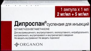 Показания к применениюЛечение состояний и заболеваний, при которых терапия ГКС позволяет достичь адекватного клинического эффекта (необходимо учитывать, что при некоторых заболеваниях терапия ГКС является дополнительной и не заменяет стандартную терапию): — заболевания костно-мышечной системы и мягких тканей, в т.ч. ревматоидный артрит, остеоартроз, бурситы, анкилозирующий спондилоартрит, эпикондилит, радикулит, кокцигодиния, ишиалгия, люмбаго, кривошея, ганглиозная киста, экзостоз, фасциит, заболевания стоп, — аллергические заболевания, в т.ч. бронхиальная астма, сенная лихорадка (поллиноз), аллергический бронхит, сезонный или круглогодичный ринит, лекарственная аллергия, сывороточная болезнь, реакции на укусы насекомых, — дерматологические заболевания, в т.ч. атопический дерматит, монетовидная экзема, нейродермиты, контактный дерматит, выраженный фотодерматит, крапивница, красный плоский лишай, инсулиновая липодистрофия, гнездная алопеция, дискоидная красная волчанка, псориаз, келоидные рубцы, обыкновенная пузырчатка, герпетический дерматит, кистозные угри, — системные заболевания соединительной ткани, включая системную красную волчанку, склеродермию, дерматомиозит, узелковый периартериит, — гемобластозы (паллиативная терапия лейкоза и лимфом у взрослых, острый лейкоз у детей), — первичная или вторичная недостаточность коры надпочечников (при обязательном одновременном применении минералокортикоидов), — другие заболевания и патологические состояния, требующие терапии системными ГКС (адреногенитальный синдром, язвенный колит, регионарный илеит, синдром мальабсорбции, поражения слизистой глаза при необходимости введения препарата в конъюнктивальный мешок, патологические изменения крови при необходимости применения ГКС, нефрит, нефротический синдром).Применение при беременности и кормлении грудьюВ связи с отсутствием контролируемых исследований безопасности применения препарата Дипроспан, при беременности, в случае необходимости назначения препарата беременным или женщинам детородного возраста, требуется предварительная оценка предполагаемой пользы терапии для матери и потенциального риска для плода. Новорожденные, матери которых получали терапевтические дозы ГКС при беременности, должны находиться под медицинским контролем (для раннего выявления признаков надпочечниковой недостаточности). При необходимости назначения препарата Дипроспан, в период лактации следует решить вопрос о прекращении грудного вскармливания, принимая во внимание важность терапии для матери (из-за возможных побочных эффектов у детей).