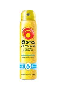 Аэрозоль Дэта «Аква» обеспечивает надежную защиту от мошек, клещей, комаров, мокрецов, слепней и москитов до 6 часов. Удобная аэрозольная упаковка позволяет легко наносить средство на кожу и на одежду. Благодаря рецептуре на водной основе не сушит кожу. Не оставляет пятен. Не содержит спирт.