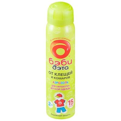 Средство для обработки одежды для защиты от насекомых.Детский аэрозоль БЭБИ ДЭТА от клещей, комаров, мошек, москитов и мокрецов незаменим для комфортного отдыха на природе.Разработан для детей от 2-х лет.Обеспечивает надежную, бережную защиту вашего ребенка от лесных и таежных (иксодовых) клещей — переносчиков возбудителей клещевого энцефалита, боррелиоза и болезни Лайма.Защищает от клещей в течении 15 суток, от кровососущих насекомых до — 10 суток. Наносится на одежду.Не оставляет пятен. Идеальное решение для людей, испытывающих дискомфорт или аллергические реакции при нанесении различных средств на кожу.Упаковка с актуатором.Только для обработки одежды и снаряжения!Не оставляет пятен на тканях.Высшая степень эффективности по классификации НИИД