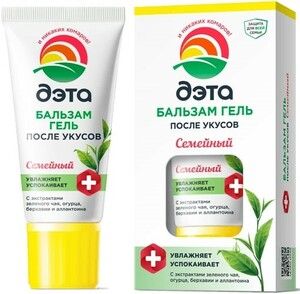 Бальзам-гель после укусов с экстрактом зеленого чая, огурца, берхавии и аллантоином.Бальзам после укусов ДЭТА семейный эффективен для устранения неприятных ощущений после укусов насекомых. Бальзам мягко охлаждает кожу, снимает зуд и покраснения.Активные компоненты: Экстракт зеленого чая Экстракт огурца и берхавииЭкстракт зеленого чая, входящий в состав бальзама, является природным антиоксидантом, обладает противовоспалительным действием, богат витаминами С и Е.Экстракт огурца снимает отечность, экстракт берхавии оказывает успокаивающее действие.Бальзам хорошо увлажняет и питает кожу тела.