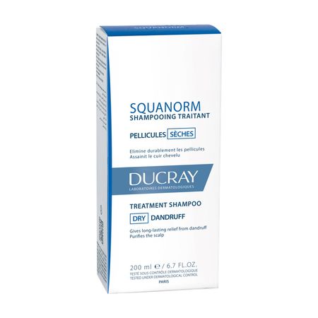 Ducray Squanorm Shampooing Traitant Antipelliculaire Pellicules Sèches (Дюкрэ Скванорм Шампунь от сухой перхоти) для сухой, чувствительной кожи. Причиной появления сухой перхоти — ровных, белых чешуек, которые обильно отшелушиваются — является грибок рода Malassezia. Для эффективной борьбы с такой перхотью используйте Ducray Squanorm Shampooing Traitant Antipelliculaire. Шамнунь Скванорм надолго устраняет сухую перхоть, очищает кожу головы, обеззараживает и успокаивает зуд. Данные клинического исследования (применение 3 раза в неделю в течение 4 недель, 42 участника) -86% устранение перхоти, +86% улучшение качества жизни. Успокаивающий эффект отметили 100% участников. Активные компоненты: гуанидин гликолят — кератолитик, предотвращает появление чешуек; пироктон оламин очищает, воздействует на грибы рода Malassezia, которые вызывают перхоть; глицерин увлажняет, способствует восстановлению баланса кожи головы.