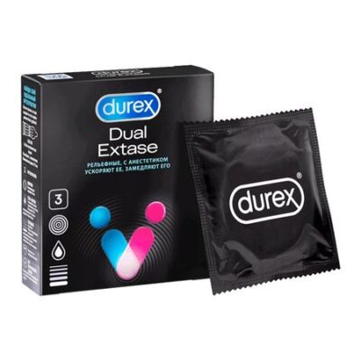 Рельефные презервативы Durex® Dual Extase разработаны для достижения оргазма обоими партнерами. Анестетик (бензокаин — 0,14 г.) внутри презервативов Durex® Dual Extase может помочь продлить половой акт у мужчины, а ребра и пупырышки на поверхности презерватива могут помочь усилить стимуляцию и ускорить наступление оргазма у женщины. Обоюдное удовольствие – один из приоритетов сексуальных отношений! • Рельефные, с накопителем • С ребрами и пупырышки (могут помочь усилить стимуляцию и ускорить наступление оргазма у женщины) • С анестетиком (может помочь продлить половой акт у мужчины) • Анатомической формы «EASY-ON» • С силиконовой смазкой • Без неприятного запаха • Длина – 195 мм, ширина — 56 мм Дерматологически протестированы. 100% проверены электроникой. Ни один из методов контрацепции не может гарантировать 100% защиты от нежелательной беременности, ВИЧ или иных заболеваний, передающихся половым путем.