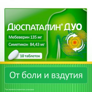 Главная » Аптека Дюспаталин ДУО Таблетки 135 мг + 84,43 мг 10 шт Просмотров 10 Овальные двояковыпуклые таблетки, покрытые плёночной оболочкой белого цвета. На поперечном срезе ядро белого или почти белого цвета. Верофарм