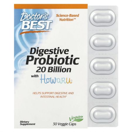 Science-Based Nutrition™Поддерживает здоровье пищеварительной системы и кишечникаПищевая добавкаВеганский продуктБез ГМОБез глютенаБифодобактерии и лактобактерии — важные компоненты микрофлоры кишечника. Кишечный тракт содержит большое количество бактерий, которые вносят важный вклад в здоровую иммунную реакцию организма. Меняющийся стиль жизни, периодические стрессы, неправильное питание или неблагоприятные факторы окружающей среды способствуют потере полезных бактерий, что может вызвать нарушение пищеварения в кишечной флоре*. Сбалансированная микрофлора кишечника жизненно важна для поддержания организма в здоровом рабочем состоянии*.Пищеварительный пробиотик Doctor’s Best содержит три штамма бифидобактерий (Bifidobacterium) и три штамма лактобактерий (Lactobacillus), которые доказали свою пользу для здоровья пищеварительной системы и всего тела. Научные исследования показали, что употребление этих специфических штаммов полезных бактерий поддерживает несколько физиологических функций, в частности, естественную иммунную систему организма и общее состояние кишечника. Пробиотические штаммы с высокой клинической эффективностью в 20 миллиардов колониеобразующих единиц (КОЕ), содержащиеся в пищевом пробиотике Doctor’s Best, способствуют здоровой функции желудочно-кишечного тракта.Способствует здоровой кишечной флореПомогает обеспечить нормальное пищеварение и регулярный стул Помогает поддерживать общее здоровье кишечника
