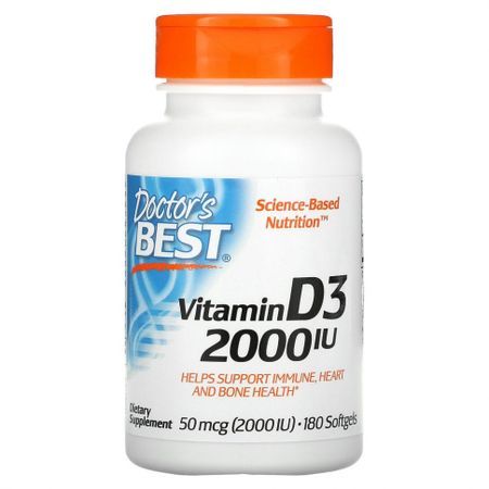 Science-Based Nutrition™ Помогает поддерживать естественные иммунные реакции, здоровье сердца и костейПищевая добавкаБез ГМОНе содержит глютенаНе содержит сои Витамин D3 от Doctor’s Best содержит D3 (в виде холекальциферола), необходимый организму для регулирования уровня фосфора и кальция, способствующих здоровью костей, зубов и сердца. Витамин D3 вырабатывается в коже за счет поглощения солнечных УФ-лучей и в ограниченных количествах поступает с пищей. Защита от солнца и климатические факторы могут влиять на низкий уровень витамина D3. Витамин D3 полезен для иммунной и сердечно-сосудистой систем, плотности и структуры костей, а также функционирования клеток. Он играет важную роль в работе большинства органов и систем организма и влияет на химические посредники иммунной системы.Помогает регулировать количество кальция и фосфора, необходимых для здоровья костей и зубов.Способствует укреплению иммунной системы и сердца.
