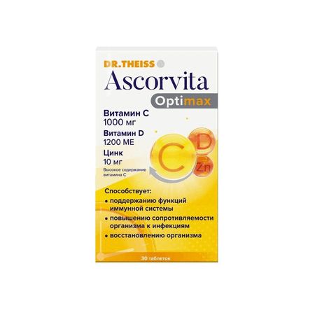 Биологически активная добавка к пище. Не является лекарственным средством Высокое содержание витамина С Способствует: — поддержанию функций иммунной системы — повышению сопротивляемости организма к инфекциям — восстановлению организма Аскорвита Оптимакс является дополнительным источником витамина С, витамина D и цинка. Используется при дефиците витамина С, для повышения сопротивляемости организма к инфекциям, несбаланированном питании, повышенных умственных и физических нагрузках, обладает антиоксидантными свойствами. Дополнительный источник витамина D, способствует снижению риска респираторно-вирусных инфекций. Цинк способствует поддержанию иммунитета.