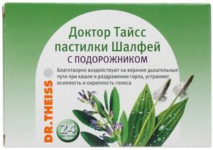 Доктор Тайсс пастилки Шалфей с подорожником.Благотворно воздействуют на верхние дыхательные пути при кашле и раздражении горла, устраняют осиплость и охриплость голоса.С витамином С.