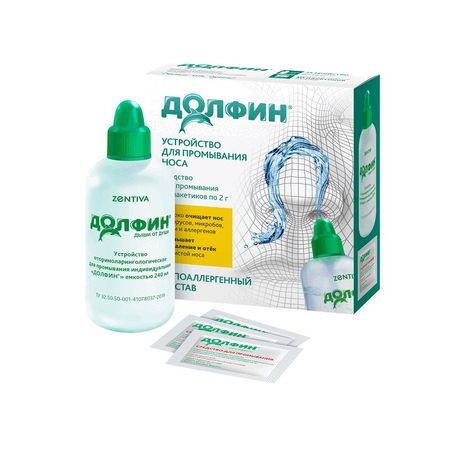 Средство для промывания устройства оторинола- рингологического для промывания индивидуального «Долфин» (далее — средство) применяется с устройством оториноларингологическим для промывания индиви- дуальным «Долфин» емкостью 120 или 240 мл (далее — устройство) для профилактики и лечения ЛОР-заболеваний посредством промывания раствором средства.Действие:средство уменьшает проявления воспаления и отека слизистой носа и носоглотки, очищает слизистую оболочку от аллергенов (пыль, пыльца растений, медикаменты и др.), способствует увлажнению и регенерации слизистой оболочки, улучшает защитные свойства слизистой и положительно влияет на клиническое течение воспалительных и аллергических заболеваний слизистой носа и носоглотки.Регулярное промывание носоглотки раствором средства для промывания обеспечивает профилактику острых и обострения хронических заболеваний слизистой носа и носоглотки.Благодаря процедуре полного объемного промывания из носа вымываются вирусы, бактерии, аллергены, пыль и другие чужеродные агенты и восстанавливается свободное носовое дыхание. За счет очищения слизистой улучшается движения ресничек мерцательного эпителия и повышаются защитные функции носа.Процедура промывания «Долфин» не доставляет неприятных ощущений.«Долфин» не является лекарственным средством, содержит только натуральные компоненты и абсолютно безопасен, идеально подходит беременным, оберегая организм будущей мамы и ее малыша.В основе состава «Долфин» — каменная соль (галит). Она содержит большое количество необходимых для здоровья микроэлементов, таких как калий, магний, кальций, сульфат, натрий и др.Этот препарат без трав для людей с аллергией на растительные компоненты. Его состав не содержит экстракты растений.Как часто можно промывать нос ДолфиномСолевой раствор сушит слизистую носа. Поэтому слишком часто злоупотреблять процедурой не следует. Сколько раз промывать нос Долфином:2-3 раз в день в период острой фазы болезни;1 раз в день в качестве профилактики, а также при хроническом синусите вне периодов обострения.