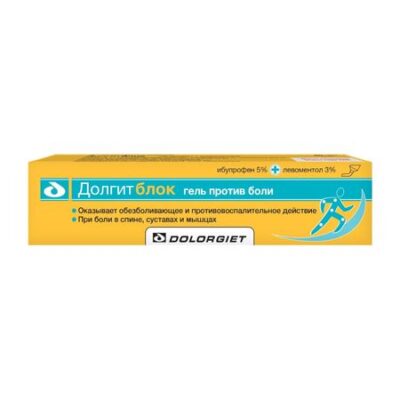 Фармакологические свойства Фармакодинамика Долгитблок представляет комбинацию двух активных веществ – ибупрофена и левоментола. Ибупрофен является нестероидным противовоспалительным средством, производным пропионовой кислоты, неизбирательно блокирует ферменты циклооксигеназу 1 (ЦОГ-1) и циклооксигеназу 2 (ЦОГ-2), вследствие чего подавляет синтез простагландинов – медиаторов боли, воспаления и гипертермической реакции. При местном применении ибупрофен оказывает обезболивающее, противовоспалительное и противоотечное действие. Левоментол оказывает местнораздражающее действие, что обуславливает быстрое развитие обезболивающего эффекта препарата. Комбинация ибупрофена и левоментола уменьшает боль и воспаление, эффективна при боли в суставах при движении и в покое, уменьшает утреннюю скованность суставов. Фармакокинетика После нанесения на кожу ибупрофен обнаруживается в эпидермисе и дерме через 24 часа. Достигает высокой терапевтической концентрации в подлежащих мягких тканях, суставах и синовиальной жидкости.