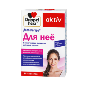 ДОППЕЛЬГЕРЦ® АКТИВ ДЛЯ НЕЁ Витаминно-минеральный комплекс для женщин Разработан в соответствии с учетом потребностей женского организма Компоненты комплекса способствуют повышению уровня энергии, сохранению молодости и естественной красотыВитамин А является антиоксидантом, способствует повышению сопротивляемости организма к ин-фекциям. Витамин D3 способствует улучшению фосфорно-кальциевого обмена в организме, участвует в мине-рализации костной ткани, способствует укреплению костей.Витамин С обладает антиоксидантными свойствами, способствует улучшению сопротивляемости орга-низма к неблагоприятным факторам внешней среды. Играет важную роль в окислительно-восстановительных процессах. Витамин В1 оказывает действие на углеводный и энергетический обмен, он необходим для нормально-го функционирования нервной и мышечной тканей. Недостаточность витамина В1 характеризуется нарушением умственных функций, а также развитием сердечной недостаточности.Витамин В2 — рибофлавин в форме коферментов участвует в окислительно-восстановительных реак-циях, способствует повышению восприимчивости цвета зрительным анализатором и темновой адапта-ции.Недостаточное потребление витамина B2 сопровождается нарушением состояния кожных покровов, слизистых оболочек, нарушением светового и сумеречного зрения.Витамин В6 – пиридоксин в форме своих коферментов участвует в превращениях аминокислот, мета-болизме триптофана, липидов и нуклеиновых кислот, участвует в поддержании иммунного ответа, про-цессах торможения и возбуждения в центральной нервной системе, способствует нормальному форми-рованию эритроцитов, поддержанию нормального уровня гомоцистеина в крови.Витамин В12 необходим в процессе кроветворения, а также жирового обмена в тканях печени. Спо-собствует делению клеток и поддержанию нормального функционирования нервной системы. Фолиевая кислота способствует нормальному кроветворению, имеет важное значение при образова-нии ДНК и РНК, которые участвуют в непосредственной передаче наследственных признаков. Биотин участвует в синтезе жиров, гликогена, метаболизме аминокислот. Недостаточное потребление этого витамина может вести к нарушению нормального состояния кожных покровов.Ниацин необходим для нормального формирования и функционирования нервной, пищеварительной и эндокринной систем. Способствует улучшению работы мозга и сердечно-сосудистой системы, имеет важное значение для выработки энергии.Пантотеновая кислота участвует в белковом, жировом, углеводном обмене, обмене холестерина, синтезе ряда гормонов, гемоглобина, способствует всасыванию аминокислот и сахаров в кишечнике, поддерживает функцию коры надпочечников.Кальций участвует в формировании и в обмене веществ в костной ткани, способствует нормальной свертываемости крови, участвует в передаче нервных импульсов и в работе сердечной деятельности. Магний является неотъемлемой частью многих клеточных процессов, включая продукцию энергии, синтез белков. Способствует снижению возбудимости, повышает устойчивость к стрессу. Железо – микроэлемент, необходимый для синтеза гемоглобина, играет важную роль в процессах кро-ветворения, участвует в ряде окислительно-восстановительных реакций. Йод важен для поддержания физической активности женщины, полез