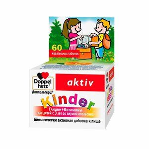 Доппельгерц Kinder Глицин+Витамины Для Детей С 3 Лет Со Вкусом Апельсина — Комплекс глицина с витаминами для детей за счет входящих ингредиентов способствует укреплению нервной системы, повышению психоэмоциональной устойчивости и умственной работоспособности, улучшению памяти и нормализации сна. Улучшает метаболические процессы в тканях мозга.Содержание в 1-й таблетке/2-х таблетках:Витамин С, мг 15/30Витамин В6, мг 0,4/0,8Витамин В1, мг 0,3/0,6Глицин, мг 50/100Пищевая и энергетическая ценность: 1 жевательная таблетка содержит 9 кДж/2 ккал, жиры 0 г, белки 0,1 г, углеводы 0,5 г.Активные ингредиенты:Глицин — заменимая аминокислота, которая вырабатывается в организме человека и постоянно расходуется. Благодаря глицину головной мозг способен выдерживать повышенные умственные нагрузки, он возвращает работоспособность мозга и способствует развитию памяти у детей. Глицин увеличивает концентрацию внимания, избавляет от быстрой и частой утомляемости, снижает утомляемость, облегчает процесс засыпания, оказывает мягкое успокаивающее действие. Поэтому его прием так необходим для детей дошкольного и школьного возраста.Витамин С — обладает антиоксидантными свойствами, улучшает защитные силы детского организма и повышает показатели иммунитета.Витамин В6 — участвует во многих биохимических реакциях, необходимых для поддержания жизненно важных процессов растущего организма ребенка. Способствует нормализации работы нервной системы.Витамин В1 — необходим для обмена веществ в организме, поддерживает хорошее самочувствие, снимает усталость, раздражительность, нервозность. Полезен при нарушениях деятельности мозга и проблемах с обучением.