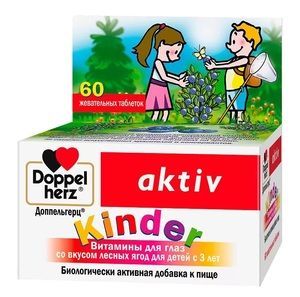Цинк способствует улучшению кровоснабжения в сосудах оболочек глаза, обеспечивая орган зрения всеми питательными веществами и кислородом. Необходим для поддержания функции зрительного аппарата у детей. В сочетании с другими витаминами помогает защитить сетчатку глаза и снизить риск дегенерации желтого пятна. Бета-каротин является активным антиоксидантом, который участвует в защите органов зрения от воздействия свободных радикалов. Витамин А способствует увлажнению роговицы глаза, сохраняет ее от сухости и повреждений. Необходим для зрения на свету, в темноте и цветового зрения.Витамин Е участвует в антиоксидантной защитной системе глаз, улучшает метаболизм, восстанавливает ткани глаза и принимает участие в передаче импульсов изображения. Способствует предотвращению дегенерации желтого пятна и отслоения сетчатки.Витамин В2 участвует в окислительно-восстановительных процессах в организме и тканевом дыхании. Входит в состав зрительного пурпура, который защищает сетчатку глаза от вред¬ного воздействия ультрафиолетовых лучей. Биологически активные вещества Содержание в 1-й таблетке / 2-х таблетках % от рекомендуемой суточной потребности* 1 таблетка в день 2 таблетки в день Дети 3-7 лет Дети 7-11 лет Дети 11-14 лет Дети 14-18 лет мальчики девочки юноши девушки Цинк, мг 3,5/7,0 44 70 58 58 58 58 Витамин Е, мг 2,6/5,2 37 52 43 43 35 35 Витамин В2, мг 0,6/1,2 60 100 80 80 67 80 Витамин А, мкг 240/480 48 68 48 60 48 60 Бета-каротин, мг 0,9/1,8 — — — — — — Лютеин, мг 2/4 — — — — — — * согласно МР 2.3.1.2432-08 «Нормы физиологических потребностей в энергии и пищевых веществах для различных групп населения РФ».Указания для больных сахарным диабетом: 1 жевательная таблетка содержит 0,08 хлебных единиц.