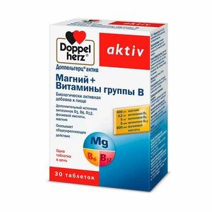 Кому рекомендован прием Доппельгерц актив Магний + Витамины группы B?Микроэлемент магний важен для энергоснабжения клеток, обменных процессов, стабилизации работы сердечной мышцы. Он принимает участие в процессе нервно-мышечного возбуждения. В тоже время в организме он содержится в крайне малых количествах. Витамин B6 используют в лечении неврологических расстройств, нарушении внимания, при депрессиях. Витамин В1 участвует в обменных процессах и поддерживает нормальную деятельность нервной системы. Витамин B12 применяется для лечения и профилактики анемии, защищает от развития инфаркта и инсульта, нормализует работу нервной системы.Таким образом, данный комплекс рекомендован людям, испытывающим дефицит магния, который сопровождается следующими симптомами: Усталость, вялость, низкий уровень энергии Повышенная нервозность Синдром хронической усталостиЧто такое синдром хронической усталости?Для установления диагноза «Синдром хронической усталости» необходимо наличие двух обязательных условий: Персистирующей усталости, значительно снижающей уровень активности, на протяжении не менее 6 месяцев. Не менее 4 из ниже перечисленных симптомов: Нарушение памяти или концентрации внимания; боль в горле; увеличение лимфатических узлов; боль или скованность в мышцах; боль в суставах; вновь возникающая головная боль; сон, не приносящий восстановление сил; усталость после физической нагрузки. Должна отсутствовать другая патология, которая может объяснить подобное состояние (например, анемия). В клинических исследованиях подтверждается позитивное терапевтическое действие комбинации магния (лактат) и витамина В6 (пиридоксина гидрохлорид) на выраженность симптомов, характерных для синдрома хронической усталости [1,2]. [1] Громова О.А.. Авдеенко Т.В., Бурцев Е.М., 1998[2] Mousain-Bosc M., Roche M., Rapin J et al., 2004). Компонент таблеток % от рекомендуемой суточной дозы Магний 400 мг 100 Витамин B1 4,2 мг* 300 Витамин B6 5 мг* 250 Витамин B12 5 мкг* 500 Фолиевая кислота 600 мкг* 300 *- не превышает верхний допустимый уровень потребления.Указания для больных сахарным диабетом: 1 таблетка содержит 1,1 ккал/ 4,6 кДж и 0,04 хлебных единиц.