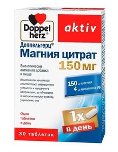 Магний — жизненно необходимое минеральное вещество, которое организм не может вырабатывать самостоятельно. Недостаток магния в организме человека может способствовать развитию стресса, синдрома хронической усталости, артериальной гипертонии, сосудистых нарушений. При стрессе из организма выводится повышенное количество свободного ионизированного магния. Дополнительный прием может повысить устойчивость к стрессу. Также применение магния может улучшить качество сна. Витамин В6 (пиридоксин) — дополняет магний, имея схожие с ним положительные эффекты для организма, действуя совместно с ним и поддерживая процесс усвоения магния. Витамин B6 участвует в многочисленных ферментативных реакциях и важен для метаболизма жиров, углеводов и белков. Он необходим для синтеза гемоглобина, а также для нормальной функции и производства эритроцитов. Витамин B6 играет важную роль в регуляции метаболизма аминокислоты гомоцистеина в организме. Высокие уровни этой аминокислоты связывают с повышенным риском повреждения сосудистых структур. Компонент таблеток % от рекомендуемой суточной дозы Магний 150 мг 38 Витамин B6 4 мг 200* * — не превышает верхний допустимый уровень потребления.Пищевая и энергетическая ценность: 1 таблетка содержит 15 кДж/ 3 ккал, жиры 0 г, белки 0 г, углеводы 0 г.Указания для больных сахарным диабетом: не содержит хлебных единиц.