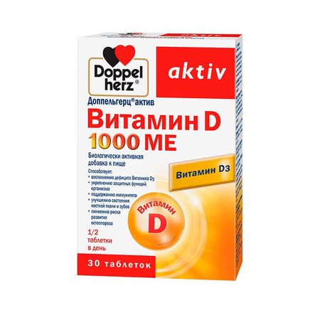 ДОППЕЛЬГЕРЦ АКТИВ ВИТАМИН D 1000МЕ — способствует восполнению дефицита витамина D3, укреплению защитных функций организма, поддержанию иммунитета и улучшению психоэмоционального состояния (настроения), улучшению состояния костной ткани и зубов, снижению риска развития остеопороза 1/2 таблетки содержит: Витамин D3 12,5 мкг — 250%* от рекомендуемого уровня суточного потребления * не превышает верхний допустимый уровень рекомендуемого суточного потребления согласно «Единым санитарно-эпидемиологическим и гигиеническим требованиям к товарам, подлежащим санитарно-эпидемиологическому надзору (контролю)» ТС ЕврАзЭС, утвержденные Решением КТС №299 от 28.05.2010, приложение 5 Пищевая и энергетическая ценность: ½ таблетки содержит 1 кДж/1ккал, белки 0 г, жиры 0 г, углеводы 0 г. Указания для больных сахарным диабетом: не содержит хлебных единиц. Витамин D3 (холекальциферол) — жизненно важный витамин, необходимый для обеспечения деятельности практически всех органов и систем человеческого организма. Холекальциферол синтезируется в коже под действием солнечных лучей. Как известно, территория России расположена в зоне риска развития дефицита. Витамин D3 cспособствует функционированию иммунной системы, активируя защитные силы организма, тем самым помогая снижать риск развития простудных заболеваний, способствует улучшению писхоэмоционального состояния (настроения). Важной функцией витамина D3 является регулирование метаболизма кальция и фосфатов, что способствует оптимальной минерализации и росту скелета, прочности костей и зубов, поддержанию силы мышц, защищая от падения и переломов. Дополнительный приём витамина D3 возможен женщинами в период менопаузы для поддержания женского здоровья, так как при дефиците витамина D3 возрастает риск развития остеопороза. При низких уровнях витамина D3 могут ухудшаться когнитивные функции. Витамин D3 помогает улучшить работу мозга.