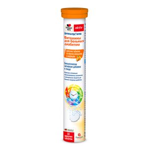 Доппельгерц Витамины для больных диабетом восполняет повышенную потребность в витаминах, антиоксидантах, микроэлементах и минеральных веществах у больных сахарным диабетом.В результате корректировки обмена веществ больных, страдающих сахарным диабетом, например, при повышенном выделении магния, удается улучшить состояние организма. Компонент шипучих таблеток % от рекомендуемой суточной дозы Витамин E 42 мг 420* Витамин C 200 мг 333* Витамин B1 2 мг 143* Витамин B2 1,6 мг 100 Витамин B6 3 мг 150* Витамин B12 9 мкг 900* Фолиевая кислота 450 мкг 225* Биотин 150 мкг 300* Никотинамид (витамин PP) 18 мг 100 Пантотеновая кислота 6 мг 100 Магний 200 мг 50 Цинк 5 мг 33 Селен 55 мг 79 Хром 60 мкг 120** * — не превышает верхний допустимый уровень потребления ** — адекватный уровень потребления