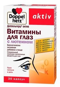 Лютеин, зеаксантин, витамины А, С, Е и цинк — специальный комплекс питательных веществ для глаз. Лютеин и зеаксантин — основные компоненты антиоксидантной системы защиты глаза. В ходе эволюции в глазу сформировалась достаточно надежная система защиты от опасности фотоповреждения, основными компонентами которой являются каротиноиды. Среди всех каротиноидов только лютеин и зеаксантин обладают способностью проникать в сетчатку и эффективно защищать глаза. Такая защита необходима для обеспечения дневного зрения, а тем более зрения в условиях слишком яркой или опасной по спектральному составу световой среды. Компонент капсул % от рекомендуемой суточной дозы Витамин A 800 мкг 100 Витамин C 250 мг 417* Витамин E 36 мг 360* Лютеин 6 мг 120** Зеаксантин 300 мкг 30** Цинк 2,5 мг 17 * не превышает верхний допустимый уровень потребления.** адекватный уровень потребленияУказания для больных сахарным диабетом: 1 капсула содержит 2,6 ккал/10,8 кДж и 0,01 хлебных единиц.