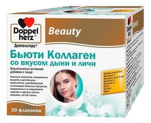 Пептиды коллагена для более упругой и гладкой кожи.Доппельгерц Бьюти Коллаген со вкусом дыни и личи в питьевых флаконах содержит пептиды коллагена для Вашей красоты, специально подобранный комплекс витаминов и микроэлементов и экстракт ягод асаи. Пептиды коллагена способствуют выравниванию поверхности кожи и повышению ее эластичности Витамин А, цинк и биотин необходимы для поддержания кожи в хорошем состоянии Медь – один из главных компонентов красоты, поскольку без нее становится невозможной выработка коллагена и эластина, отвечающих за молодость и подтянутость кожи. От данного минерала во многом зависит состояние сосудов и костей, цвет и блеск волос. Экстракт асаи способствуют замедлению возрастных изменений кожиВысококачественная биологически активная добавка Доппельгерц Бьюти Коллаген предназначена для длительного использования. Возможный эффект наступает через 4-8 недель. Кожа – зеркало нашей жизни.Свежая, жизненная кожа ассоциируется с молодостью, красотой и радостью жизни. Однако ввиду естественных процессов старения, а также из-за влияния окружающей среды кожа меняется – теряет упругость и эластичность.Ежедневный уход, хорошее питание и физические упражнения на свежем воздухе помогут вам дольше выглядеть моложе. Но есть также вещества, которые могут способствовать поддержанию состояния кожи изнутри: коллагеновые пептиды.Когда мы молоды, наша кожа упругая, эластичная, гладкая и красивая. Она удерживает влагу и на ней нет морщин. Однако с годами образование коллагена уменьшается. С годами кожа: Теряет влагу и становится более сухой Становится менее эластичной Становится тоньше и имеет тенденцию к образованию морщинКоллаген как важный структурный компонент кожи.Коллаген является основным структурным компонентом кожи, составляющим около 80% ее соединительной ткани. Известно, что на свойства кожи влияют эндогенные факторы и факторы окружающей среды, включая старение, ультрафиолетовое излучение, гормоны и питание. С возрастом наша кожа становится тоньше: чем меньше коллагена, тем меньше эластичность кожи. Уже с 25 лет организм самостоятельно снижает выработку коллагена. Кроме того, внешние факторы, такие как ультрафиолетовое излучение солнца и вредные привычки, например, курение, могут ускорить потерю коллагена.Активные компоненты пептиды коллагена VERISOL® в составе Доппельгерц Бьюти Коллаген могут стимулировать метаболизм кожи и противодействовать потере коллагенового внеклеточного матрикса изнутри. Положительный эффект пептидов VERISOL® проявляется в улучшенной структуре поверхности кожи, более быстром росте ногтей с меньшим количеством сколов на ногтях. Какой эффект оказывают пептиды коллагена?В дополнение к здоровому образу жизни пероральный прием коллагеновых пептидов также может оказывать положительное влияние на внешний вид кожи. Пептиды коллагена могут поддерживать красоту изнутри. Глубина морщин и тонких лицевых линий уменьшаются. Эластичность кожи также улучшается. Таким образом, пептиды коллагена способствуют поддержанию красивого и молодого внешнего вида кожи.Эффективность пептидов коллагена в коже научно подтверждена. В 2 плацебо-контролируемых исследованиях с коллагеновыми пептидами на женщинах было проверено, как потребление коллагеновых пептидов изменяет внешний вид 