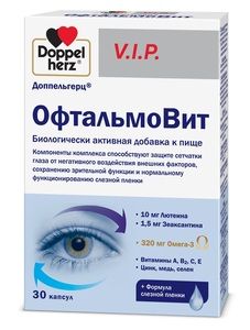 Слезная пленка – это увлажняющий и защитный слой на поверхности роговицы. Состоит из слезы и секрета желез век, предохраняет роговицу от высыхания и внешних воздействий, улучшает оптические свойства глаза. При нарушении состава слезной пленки появляется чувство дискомфорта в глазу, повышается утомляемость при зрительной нагрузке и чувствительность глаз к яркому свету, ветру и другим воздействиям внешней среды.«Доппельгерц® V.I.P. ОфтальмоВит» содержит лютеин, зеаксантин, а также витамины, микроэлементы и ПНЖК Омега-3 для поддержания оптимального функционирования слезной пленки.  На функцию зрения негативно влияют следующие факторы: Повышенная нагрузка на глаза (работа за компьютером, частый просмотр телевизора, ночное вождение и др.) Сквозняк, сухой загрязненный воздух (например, сигаретный дым) Ультрафиолетовое излучение (синий свет, излучаемый электронными устройствами, мониторами и энергосберегающими лампами) Ношение контактных линз Несбалансированное питание Возраст 50+Витамины С и Е, цинк и селен – антиоксидантная система защиты глаз. Повышенная нагрузка на зрение, ультрафиолетовое воздействие подвергают глаза постоянному оксидативному стрессу. Для нейтрализации свободных радикалов организм должен получать оптимальное количество необходимых антиоксидантов, таких как цинк, селен, витамины С и Е. Витамин В2 – важнейший регулятор окислительно-восстановительных процессов, важен для формирования слизистой оболочки глаза. Витамин А (ретинол) играет важную роль в зрительных процессах и важен для образования слизистых оболочек, в том числе и конъюнктивы. Он обладает способностью защищать организм от разрушительного действия свободных радикалов. Витамин А несет основную функцию в процессах световой адаптации, так как он необходим для биосинтеза светочувствительного пигмента палочек сетчатой оболочки глаза (родопсина).  Витамин А очень важен для зрения, поскольку является основным компонентом родопсина – белка, который поглощает свет в рецепторах сетчатки, а также поддерживает функционирование конъюнктивальных мембран и роговицы.  Медь имеет большое значение для поддержания эластичности стенок кровеносных сосудов всего организма. ПНЖК Омега-3 принимает участие в синтезе эйкозаноидов и простагландинов.Прием ПНЖК Омега-3 способствует снижению риска  возрастной макулярной дегенерации. ПНЖК Омега-3 могут улучшать характеристики слезной пленки. Имеются данные, что на фоне приёма ПНЖК Омега-3 наблюдается снижение сухости глаз и увеличение слезной секреции.Лютеин – каротиноид,  является основным фитохимическим соединением, защищающим глаза от фотоповреждения. Находящиеся в хрусталике и сетчатке каротиноиды лютеин и зеаксантин обеспечивают защиту фоторецепторных клеток от кислородных радикалов. Зеаксантин – каротиноид, который обеспечивает защиту глаз от опасности фотоповреждения. Зеаксантин вместе с лютеином являются наиболее активными соединениями антиоксидантной защиты глаз, только зеаксантин и лютеин обнаруживаются в сетчатке, где их сконцентрировано до 70% от общего содержания в глазу. Компонент капсул % от рекомендуемой суточной дозы Витамин C 120 мг 200* Витамин B2 1,4 мг 88 Витамин A 400 мкг 50 Витамин E 10 мг 100 Цинк 10 мг 67 Селен 80 мкг 114* Медь 750 мкг 75** ПНЖК Омега-3 320 мг 16** Эйкозапентаеновая кислота 1