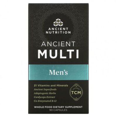 Ферментированные травыДревнее питание для современного мираSuper Nutrition с создается с использованием традиционного китайского метода (TCM). Формула Ancient Multi Men’s сочетает в себе:Множество витаминов и минералов, предназначенных для мужчин, включая ферментированные пробиотиками витамины C и E, коэнзимированные витамины группы B, не содержащий сои витамин K2 (MK-7), витамин A (бета-каротин) и цинк, активированный ферментами и селенПрорыв в питании для мужчин: древние суперпродукты, включая экстракты трав, тонизирующие грибы, костный бульон, печень новозеландского крупного рогатого скота, икра дикой рыбы и многое другое.Вдохновение от TCMПечень новозеландского скота: эффективный источник питательных веществ.Семена пажитника: полезный ингредиент для мужского здоровья.Экстракт имбиря: согревающая специя для хорошего самочувствия.