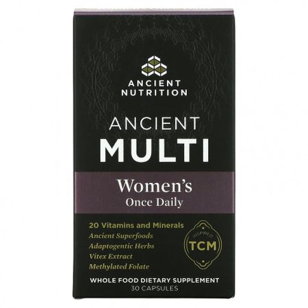 20 витаминов и минераловПродукт вдохновлен TCMДревние суперфудыАдаптогенные травыЭкстракт витексаМетилированный фолатПищевая добавка из цельных ингредиентовАктивированный ферментами продуктФерментированные травыДревнее питание для современного мираSuper Nutrition с создается с использованием традиционного китайского метода (TCM). Средство Ancient Nutrition для женщин для ежедневного приема содержит:Множество витаминов и микроэлементов, разработанных с учетом потребностей женского здоровья, включая витамин С с ферментами и коэнзимами, витамины группы В с ферментами и коэнзимами, запатентованную форму метилированного фолата, активированное ферментами железо и витамин К2 (МК-7) без сои.Древние суперфуды, в том числе экстракты трав, тонизирующие грибы, костный бульон, печень новозеландского скота, икра дикой рыбы и многое другое обеспечивают прорыв в области питания для женщин.Экстракт ягод годжи: древний символ долголетия.Экстракт гриба рейши: известный в древности как гриб, обладающий сверхъестественными свойствами.