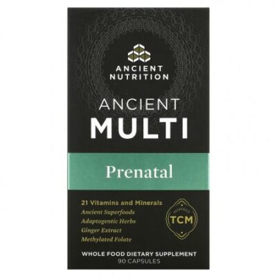 ** Минерал, активированный ферментами 21 витамин и минералыДревние суперфудыАдаптогенные травыЭкстракт имбиряМетилированный фолатПродукт вдохновлен TCMПищевая добавка из цельных ингредиентовАктивированный ферментами продуктФерментированные травыДревнее питание для современного мираSuper Nutrition с создается с использованием традиционного китайского метода (TCM). Комплекс пренатальных витаминов Ancient Multi для ежедневного приема содержит:Множество витаминов и минералов, разработанных с учетом потребностей дородового периода, включая запатентованную форму метилированного фолата, ферментированные и коферментированные витамины группы В, активированное ферментами железо, ферментированный пробиотиками витамин С, витамин К2 (МК-7) без соиЭкстракты трав, в том числе имбиряДревние суперфуды, в том числе тонизирующие грибы, костный бульон, печень новозеландского скота, икру дикой рыбы и многое другое, что обеспечивает прорыв в области пренатального питания.Говяжий костный бульон: основной суперфуд для хорошего самочувствия.Экстракт корицы: антиоксидантная согревающая специя.Экстракт имбиря: согревающая специя для хорошего самочувствия.