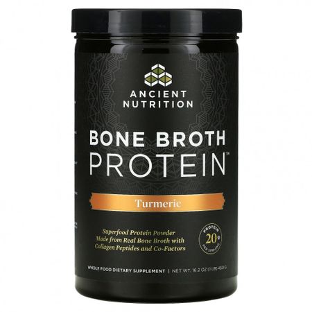 Концентрат протеина из куриного костного бульона, органический экстракт корня куркумы.23 г++ Суточная норма не определена. 20 г белка в 1 порциипорошок из суперпротеинаИзготовлено из натурального костного бульона с пептидами и кофакторами коллагенаПищевая добавка из цельных ингредиентовDr. Axe FormulaДревнее питание для современного мираЗдоровье кожиЗдоровье суставовПодвижностьБез ГМОЗапатентованная формулаКомпания Ancient Nutrition предлагает то, что не так уж легко найти в современном мире: легкий доступ к простым питательным веществам из цельных продуктов, способствующих здоровью, силе и бодрости.Bone Broth Protein подходит для людей, соблюдающих палеодиету (подтверждено сертификатом), не содержит распространенных аллергенов и является идеальным источником белка для людей, чувствительных к молочным продуктам, зерновым культурам, яйцам, говядине, орехам и бобовым. Костный бульон — это просто! Прекрасно сочетается с супами, тушеным мясом и подходит в качестве добавки в ваши любимые пикантные блюда.Каждая порция содержит:11 200 мг коллагена типа II1600 мг хондроитина280 мг гиалуроновой кислоты30 мг глюкозамина