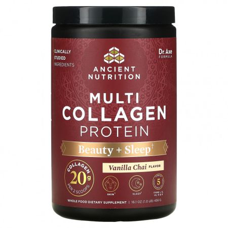 ? На момент производства. Содержит клинически изученные ингредиентыDr. Axe Formula20 г коллагена в 2 мерных ложкахДля здоровья кожиДля крепкого сна5 типов коллагена из пищевых источниковКоллаген типов I, II, III, V и XЦельнопищевая добавкаВитамин C + пробиотикиИзготовлено из рогатого скота травяного откорма, выращенного на пастбищеДля здоровья ногтейДля здоровья суставовПротеин с коллагеном нескольких типовAncient Nutrition укрепляет ваше здоровье и увеличивает жизненную энергию с помощью самых полезных питательных веществ из цельных продуктов.Наш протеин с коллагеном нескольких типов имеет уникальную формулу и содержит 5 типов коллагена из пищевых источников, которые, как было клинически доказано, поддерживают здоровье волос, кожи, суставов, а также нормальное пищеварение.Способствует крепкому сну.Визуально уменьшает морщинки в уголках глаз за четыре недели, а тон кожи — за восемь недель применения.