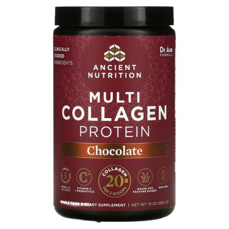 1 На момент производства. Содержит клинически изученные ингредиентыФормуа Dr. Axe Formula5 типов коллагена из пищевых источниковТипы I, II, III, V и XВитамин C + пробиотики20 г коллагена на 2 мерные ложкиЭкологически чистое сырье, травяной откормБез ГМОЦельнопищевая добавкаAncient Nutrition улучшает ваше здоровье и увеличивает жизненную силу с помощью самых полезных питательных веществ из цельных продуктов.Наш комплекс коллагенов и протеинов имеет уникальную формулу и содержит 5 типов пищевого коллагена, которые, как было клинически доказано, способствуют здоровью волос, кожи, суставов, а также нормальному пищеварению.Клинически изученный источник коллагена типов V и X для разглаживания «гусиных лапок» за 4 недели.Клинически изученный источник коллагена типов V и X для уменьшения дискомфорта в суставах за 7 дней.