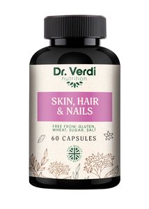 Dr.Verdi Skin Hair Nails Бьюти комплекс для кожи, волос и ногтей — это биологически активная добавка, которая содержит важные витамины и минералы для поддержания красоты и здоровья.Активные компоненты комплекса:Метилсульфонилметан (МСМ) — способствует улучшению состояния кожи, волос и ногтей благодаря содержанию серы, которая важна для образования кератина — белка, необходимого для здоровья этих тканей.L-Цистин — аминокислота, которая помогает укрепить волосы и ногти, а также улучшает состояние кожи, участвуя в образовании коллагена и кератина.L-Пролин — ещё одна аминокислота, необходимая для синтеза коллагена. Коллаген обеспечивает упругость и эластичность кожи, помогая бороться с признаками старения.Красные водоросли (L.coralliodes) — источник минералов и витаминов, который может способствовать улучшению состояния кожи и укреплению ногтей благодаря своему богатому составу.Витамин С (аскорбиновая кислота) — мощный антиоксидант, который помогает защитить клетки от повреждений, укрепляет иммунитет и участвует в синтезе коллагена.L-лизин — аминокислота, которая способствует укреплению иммунитета и улучшению состояния волос и ногтей. Она также участвует в обмене веществ.Цинк — минерал, который участвует во многих процессах в организме, включая поддержание здоровья кожи, волос и ногтей. Он также способствует укреплению иммунитета.Медь — минерал, который участвует в процессах обмена веществ и может способствовать улучшению состояния кожи и волос.Комплекс эффективен для лучшения состояния кожи, волос и ногтей, а также поддержать здоровье в целом. Перед началом приёма биологически активных добавок рекомендуется проконсультироваться с врачом.