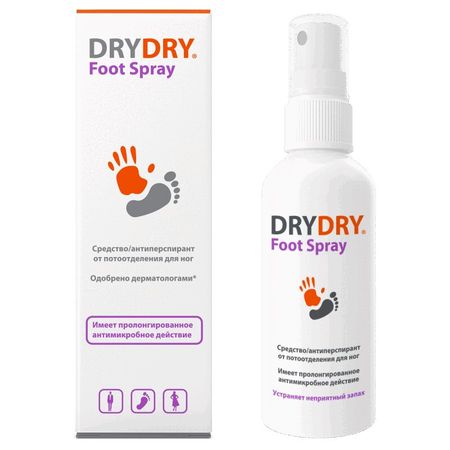 Dry Dry Foot Spray – это средство против потливости ног, обладающее охлаждающим и освежающим эффектом. Выпускается в удобной форме спрея.Преимущества Dry Dry Foot Spray: — высокоэффективное косметическое средство, имеющее в своем составе ментол;- идеальное средство против потливости ног; — имеет пролонгированное антимикробное действие;- устраняет неприятный запах;- обладает охлаждающим эффектом;- удобный 100 гр. спрей;- универсален. Подходит как женщинам, так и мужчинам; — без парфюмерных отдушек;- не имеет ограничений по длительности и частоте использования;- это продукт европейского качества. Изготавливается в Швеции.