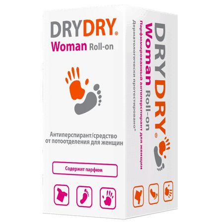 DRYDRY Woman Roll-on (ДРАЙДРАЙ Вуман) — парфюмерно-косметический антиперспирант/средство, рекомендованное к использованию при нормальном и обильном потоотделении. Разработано шведскими технологами специально для женщин. Благодаря уникальной формуле DRYDRY Woman снижает активность работы потовых желез, предотвращает появление и полностью блокирует на коже развитие микроорганизмов, создавая невидимы барьер от различного рода бактерий. Не оставляет ощущения липкости/не пачкает одежду Не имеет ограничений по длительности и частоте использования Не нарушает функцию потовых желез Не содержит ингредиенты животного происхождения