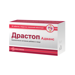 Драстоп Адванс — биологически активная добавка к пище, которая способствует регенерации хрящевой ткани.Глюкозамина сульфат представляет собой соль естественного аминомоносахарида глюкозамина, физиологически присутствующего в организме человека. Оказывает хондропротекторный и остеотропный эффекты, нормализует отложение кальция в костной ткани. Проявляет умеренное противовоспалительное действие. Предотвращает возможное метаболическое повреждение хряща от действия нестероидных противовоспалительных препаратов (НПВП) и глюкокортикостероидов (ГКС).Хондроитинсульфат является высокомолекулярным мукополисахаридом, принимающим участие в построении хрящевой ткани (служит дополнительным субстратом для образования хрящевого матрикса). Оказывает хондропротекторное действие, стимулирует регенерацию хрящевой ткани, проявляет противовоспалительное и анальгезирующее действие.Аскорбиновая кислота стимулирует синтез коллагена и умеренно повышает синтез аггрекана (основного протеогликана суставного хряща). Также в присутствии аскорбиновой кислоты значительно увеличивается синтез сульфатированных протеогликанов, снижается выраженность болевого синдрома.Марганец участвует в процессах энергообразования, метаболизме белков и жиров, синтезе костей и соединительной ткани.Метилсульфонилметан (MСM) — природное органическое соединение серы с выраженным противовоспалительным действием. Проявляет высокую биологическую активность в лечении и укреплении суставов и связок. Сера способствует всасыванию печенью минералов, имеет значение для работы мозга, образования волос, ногтей, соединительной ткани, хрящей, оказывает выраженное противоаллергическое действие.Сухой экстракт смолистой камеди босвелии — эффективное противовоспалительное средство. Не вызывает раздражения слизистой желудочно-кишечного тракта, бронхоспазмов, крапивницы. Босвелия поддерживает опорно-двигательный аппарат, оказывает противовоспалительное, антисептическое и болеутоляющее действие.Сухой экстракт коры кошачьего когтя стимулирует иммунитет, нормализует уровень иммуноглобулинов (антител), способствует разрушению и выведению тканевых и циркулирующих иммунных комплексов, оказывает противовоспалительное и антиоксидантное действие.Содержание в 1 таблетке:Глюкозамин 390,0 мгХондроитинсульфат 200,0 мгВитамин С 50,0 мгМарганец 1,5 мгПищевая ценность (содержание на 1 таблетку): белки — 0,0555 г, жиры- 0,002 г, углеводы — 0,093 г (сахар — 0 г).Энергетическая ценность — 0,762 ккал/3,188 кДж.