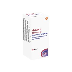 Показания к применениюЛечение и профилактика прогрессирования ДГПЖ посредством уменьшения ее размеров, устранения симптомов, увеличения скорости мочеиспускания, снижения риска возникновения острой задержки мочи и необходимости оперативного вмешательства.Противопоказания— повышенная чувствительность к дутастериду, другим ингибиторам 5α .-редуктазы, тамсулозину или любому другому компоненту, входящему в состав препарата . — ортостатическая гипотензия (в т.ч. в анамнезе) . — выраженная печеночная недостаточность . — возраст до 18 лет . — применение препарата противопоказано женщинам и детям.Побочное действиеНежелательные явления, обусловленные применением тамсулозинагидрохлорида в комбинации с дутастеридом: Очень редко ( меньше 1/10 000): аллергические реакции(сыпь, зуд, крапивница, локализированный отек и ангионевротический отек),приапизм, потеря сознания Редко (≥ .1/10 000 и меньше 1/1 000): алопеция,гипертрихоз Нечасто (≥ .1/1 000 и меньше 1/100): нарушение эякуляции,ретроградная эякуляция Часто (≥ .1/100 и меньше 1/10): гинекомастия, снижение либидо,эректильная дисфункция, головокружение Нежелательные явления, обусловленные применением тамсулозинагидрохлорида в качестве монотерапии Очень редко ( меньше 1/10 000): приапизм Редко (≥ .1/10 000 и меньше 1/1 000): потеря сознания, ангионевротический отек Нечасто (≥ .1/1 000 и меньше 1/100): учащенное сердцебиение запор, диарея, рвотаастения нарушение эякуляции ринит сыпь, зуд, крапивница постуральная гипотензия Часто (≥ .1/100 и меньше 1/10): головокружение, ортостатическая гипотонияСостав1 капсула содержит дутастерида 0,5 мг и тамсулозина гидрохлорида 0,4 мг . вспомогательные вещества: монодиглицериды кислоты каприловой, бутилгидрокситолуол (Е 321), желатин, глицерин, титана диоксид (Е171), железа оксид желтый (Е172), триглицериды средней цепи и лецитин . целлюлоза микрокристаллическая, метакрилатного сополимера дисперсия, тальк, триэтилцитрат . оболочка твердой капсулы: каррагинан (Е 407), калия хлорид, титана диоксид (Е 171), FD & C Yellow 6 (E 110), гипромеллоза, воск карнаубский, крахмал кукурузный, железа оксид красный (Е 172), SW-9008 Black Ink (шеллак, пропиленгликоль, железа оксид черный (Е172), калия гидроксид).