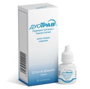 Показания к применениюснижение повышенного внутриглазного давления при открытоугольной глаукоме и внутриглазной гипертензии у пациентов, резистентных к монотерапии бета-адреноблокаторам и или аналогами простагландина.Применение при беременности и кормлении грудьюПротивопоказан во время беременности и в период грудного вскармливания.Противопоказаниябронхиальная астма; бронхиальная астма в анамнезе; тяжелая хроническая обструктивная болезнь легких; гиперреактивность бронхов; синусовая брадикардия; атриовентрикулярная блокада II-III степени; декомпенсированная хроническая сердечная недостаточность; кардиогенный шок; аллергический ринит тяжелого течения; дистрофия роговицы; гиперчувствительность к группе бета-адреноблокаторов; беременность; период кормления грудью; детский возраст до 18 лет; гиперчувствительность к компонентам препарата. С осторожностью: Неоваскулярная, закрытоугольная, узкоугольная глаукома, пигментная и врожденная глаукома, открытоугольная глаукома с псевдоафакией, псевдожефолиативная глаукома; офтальмологические воспалительные заболевания; афакия, псевдофакия с разрывом задней капсулы хрусталика, пациенты с риском развития кистоидного макулярного отека, ирита, увеита.Состав1 мл содержит травопрост 0,04 мг; вспомогательные вещества: макрогола глицерилгидроксистеарат (синоним — полиоксиэтилен гидрогенизированное касторовое масло 40 — НСО-40); бензалкония хлорида раствор (эквивалентно бензалкония хлориду); динатрия эдетат; борная кислота; трометамол; маннитол; натрия гидроксид и/или кислота хлористоводородная концентрированная — для доведения рН; вода очищенаВзаимодействие с другими препаратамиИсследований по взаимодействию с другими препаратами не проводилось. Существует вероятность усиления гипотензивного действия и/или развитие выраженной брадикардии при одновременном применении тимолола с блокаторами кальциевых каналов для приема внутрь, гуанетидином, бета-адреноблокаторами, антиаритмическими препаратами, сердечными гликозидами и парасимпатомиметиками. Развитие гипертензии после резкой отмены клонидина может усиливаться при одновременном приеме бета-адреноблокаторов. Бета-адреноблокаторы могут усиливать гипогликемическое действие противодиабетических средств. Бета-адреноблокаторы могут маскировать симптомы гипогликемии. ДуоТрав может применяться в комбинации с другими местными офтальмологическими препаратами для снижения внутриглазного давления. В этом случае интервал между их применением должен составлять не менее 5 минут. Не рекомендуется одновременное использование двух местных бета-адреноблокаторов или двух местных аналогов простагландинов!