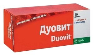 Драже, покрытые оболочкой красного цвета (витамины): круглые, двояковыпуклые драже, покрытые оболочкой красного цвета.Драже, покрытые оболочкой голубого цвета (минералы): круглые, двояковыпуклые драже, покрытые оболочкой голубого цвета.