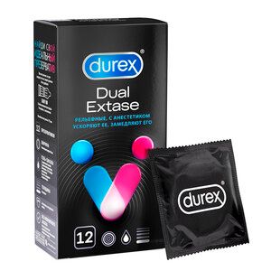 Презервативы Durex Dual Extase созданы для того, чтобы оба партнера смогли получить оргазм одновременно. Секс — это ни с чем несравнимое удовольствие, а одновременный оргазм партнеров, это те же ощущения, усиленные в два раза. Более 50% женщин жалуются на то, что их партнер достигает максимальной точки удовлетворения гораздо быстрее. Одновременно же оба партнера достигают оргазма лишь в 27% случаев. Анестетик (бензокаин) внутри презервативов Durex Dual Extase способен замедлять эякуляцию мужчин, а ребра и пупырышки на поверхности презерватива помогают усилить стимуляцию и ускорить наступление оргазма женщины. Презервативы Durex Dual Extase ускоряют ее, замедляют его. Любите друг друга. Обоюдное удовольствие — главный приоритет здоровых сексуальных отношений!