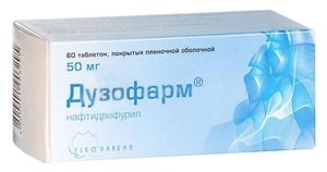 Показания к применениюВосстановительный период нарушений мозгового кровообращения. нарушения периферического кровообращения (перемежающаяся хромота, болезнь Рейно, трофические язвы).Применение при беременности и кормлении грудьюДанные об эффективности и безопасности применения нафтидрофурила при беременности и в период лактации отсутствуют.ПротивопоказанияПовышенная индивидуальная чувствительность к препарату. Инфаркт миокарда (острая стадия). Артериальная гипотензия. Геморрагический инсульт (острая стадия). Эпилепсия, повышенная судорожная готовность. Хроническая сердечная недостаточность II–III стадии (III–IV по NYHA функциональная классификация сердечной недостаточности Нью-Йоркской ассоциации кардиологов). Тахиаритмии. Возраст до 18 лет (эффективность и безопасность не установлены). С осторожностью: закрытоугольная глаукома. гиперплазия простаты.Побочное действиеПри приеме внутрь в дозах от 300 до 600 мг Дузофарм хорошо переносится в целом.Возможные побочные эффекты тошнота, рвота, боль в эпигастральной области, кишечные колики, диарея, снижение аппетита, головная боль, головокружение, нарушение сна, обратимое повышение активности печеночных ферментов, язвы слизистой оболочки желудка, аллергические реакции.Состав1 таблетка содержит: Активное вещество: нафтидрофурила оксалат — 50 мг. Вспомогательные вещества: лактоза моногидрат, микрокристаллическая целлюлоза, пшеничный крахмал, коповидон, кремния диоксид коллоидный, стеарат магния, тальк. Состав оболочки: титана диоксид, тальк, стеарат магния, макрогол 6000, метакриловой кислоты и этилакрилата сополимер, краситель солнечный закат желтый Е110.