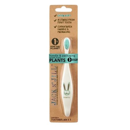 Jack N’ Jill Bio Toothbrush Bunny — органическая зубная щетка нового поколения, изготовленная из 100% кукурузного крахмала. Щетка оснащена мягкими, нейлоновыми щетинками, имеет длинную удобную рукоятку и компактную чистящую головку, которая с легкостью проникает в труднодоступные места ротовой полости, устраняет остатки пищи, налет и нейтрализует причину неприятного запаха. Щетка деликатно очищает эмаль зубов, препятствует образованию кариеса, обладает щетиной умеренной мягкости, которая не повреждает зубную эмаль. Щетка не деформируется при интенсивной чистке, четко выполняет все поставленные задачи и не ипавмирует десна. Зубная щетка от Джек Джилл прочна и удобна для детской руки, требует замены через 8 недель с начала использования.