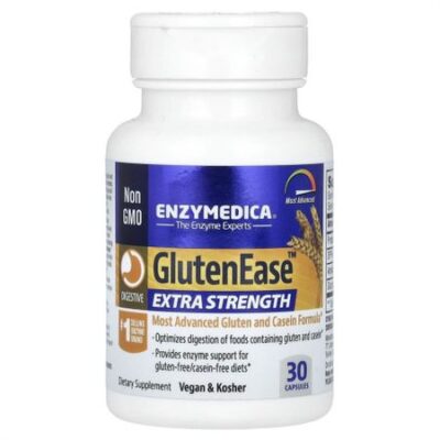 Пищевая ценностьРазмер порции: 1 капсулаПорций в упаковке: 30 Количество в 1 порции% от суточной нормыПротеаза Thera-blend™ (G2)150 000 HUT**DPP-IV (дипептилпептидаза-4)1000 DPPU**Амилаза Thera-blend™15 000 DU**Глюкоамилаза15 AGU**** Суточная норма не определена Не содержит ГМОЭксперты в области ферментовУлучшенная формулаПоддерживает здоровье пищеварительной системыЛидер продаж среди добавок с ферментамиУлучшенная формула для переваривания глютена и казеинаОптимизирует переваривание продуктов, содержащих глютен и казеинОбеспечивает ферментативную поддержку диеты, не содержащей глютен и/или казеинПищевая добавкаВеганский и кошерный продуктСертификат кошерности Kosher ParveБез наполнителейУ многих возникают трудности при переваривании белков глютена и казеина, которые обычно содержатся в углеводах, они могут вызывать неприятные ощущения, например, газы и вздутие живота. Даже при полном соблюдении диеты без глютена и/или казеина могут возникнуть проблемы, если они содержатся в других продуктах питания.Добавка GlutenEase™ для переваривания глютена с повышенной силой действия содержит ферменты протеазы Thera-blend™ (G2) и DPP-IV (дипептидил-пептидазу-4), и обладает способностью переваривать пищу, содержащую глютен и казеин, которая вдвое больше той, что имеет стандартная добавка GlutenEase. Ферменты амилазы, переваривающие крахмал, способствуют перевариванию углеводной части зерновых, например, пшеницы, которые содержат глютен.Thera-blend™ — это эксклюзивный процесс, объединяющий многочисленные виды ферментов, которые активны при различных уровнях pH. Было доказано, что ферменты, полученные методом Thera-blend, в три раза эффективнее и действуют более чем в шесть раз быстрее, чем наиболее популярные пищевые добавки для поддержки пищеварения.