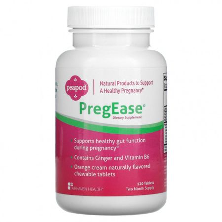 † Daily Value not established ГорохНатуральные продукты для здоровой беременностиПищевая добавкаПоддерживает здоровую работу кишечника во время беременностиСодержит имбирь и витамин B6Жевательные таблетки с натуральным вкусом апельсинаFairhaven HealthPregEase сочетает в себе имбирь и витамин B6 с карбонатом кальция, солодкой и лимонной мятой, чтобы облегчить общий дискомфорт пищеварительной системы во время беременности.