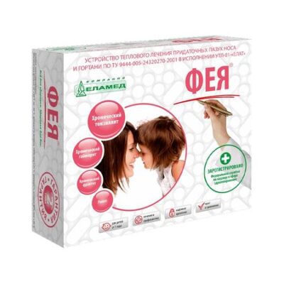 ФЕЯ (УТЛ-01) — устройство теплового лечения придаточных пазух носа и гортани по ТУ 9444-005-24320270-2001 в исполнении УТЛ-01-«ЕЛАТ» из серии медицинских устройств, выпускаемых Елатомским приборным заводом, под общей торговой маркой — ЕЛАМЕД®. Рекомендован Комитетом по новой медицинской технике Министерства здравоохранения России. Проведение процедур не требует специальной подготовки и специальных навыков. Для эффективного применения устройства изучите руководство по эксплуатации и правильно выполняйте методики лечения. Потенциальными потребителями являются дееспособные граждане, достигшие 18 лет Помните, что при утрате руководства Вы лишаетесь права на гарантийный ремонт. • Состав устройства Устройство состоит из источника питания (1) и нагревательного элемента (2), который является рабочей частью устройства, соединенных кабелем пациента (3), длина которого (2,1±0,1) м и на котором находится движковый переключатель (4), предназначенный для установки соответствующего режима работы устройства. Корпус источника питания выполнен из ударопрочного полистирола и армирован вилкой (5), использующейся для отделения от всех полюсов питающей сети. Установка температуры устройства (режима работы) осуществляется перемещением (установкой) движкового переключателя в соответствующее положение. Примечания. 1. Подключение устройства к электросети сопровождается загоранием индикатора «СЕТЬ» (7) зеленого цвета. 2. Нагрев корпуса переключателя в режимах работы «1» и «2» не является признаком неисправности устройства. Состояние органов в зависимости от режима работы приведено в таблице 1. Таблица 1 Режим работы Положение движкового переключателя 1 «1» 2 «2» 3 «3» Нагревательный элемент состоит из двух гибко соединенных эластичных нагревательных пластин специальной формы, накладываемых на прогреваемую область. Держатель нагревательного элемента (6) состоит из пластмассового держателя, повторяющего форму нагревательного элемента, и эластичной тканевой ленты с пластиковыми элементами крепления. Примечание. При лечении пользуйтесь, пожалуйста, держателем нагревательного элемента, как указано в руководстве. • Общие сведения -Устройство предназначено для прогревания придаточных пазух полости носа, лобных пазух и гортани контактным способом в стационарных, амбулаторных и домашних условиях. -При использовании устройства специальной подготовки не требуется. -Устройство может эксплуатироваться медицинским персоналом средней квалификации или самим пациентом по указанию врача. -Устройство подлежит реализации через оптовую или розничную торговую сеть. -Эксплуатировать устройство необходимо в жилых и других подобного типа помещениях при температуре воздуха от 10 до 35°С и относительной влажности 80% при 25°С. • ТЕХНИЧЕСКИЕ ХАРАКТЕРИСТИКИ Температура поверхности нагревательного элемента при нормальных условиях без контакта с поверхностью тела пациента: режим работы «1» (положение переключателя «1») — в пределах (40±5) °С; режим работы «2» (положение переключателя «2») — в пределах (47±5) °С; режим работы «3» (положение переключателя «3») — в пределах (55±5) °С. Электропитание устройства осуществляется от сети переменного тока частотой 50 Гц, напряжением ~230 (-23; +23) В. Мощность, потребляемая от электросети, не более 10 В·А. Время готовности к работе не более 10 мин. У