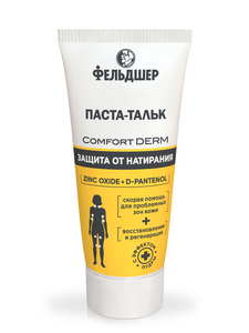 Бренд ФЕЛЬДШЕР — средства бренда — это не просто косметика, а космецевтика, т. е. сочетание косметологии и фармакологии.ФЕЛЬДШЕР ПАСТА-ТАЛЬК ЗАЩИТА ОТ НАТИРАНИЯ COMFORT DERM — подходит для всех типов кожи.Внешний вид и свойства: однородная масса, без посторонних примесей, серо — белого цвета, с лёгким цветочным ароматом.Особенности строения тела, чувствительная и тонкая кожа, повышенное потоотделение — все эти факторы могут спровоцировать натирание.А вы знали, что вопреки распространенному мнению, натирание зависит не от веса, а от строения тела?Паста-тальк покрывает кожу тонким слоем, создаёт «шелковистую защиту» с эффектом пудры, помогая справиться с проблемой натирания.D-Pantenol (Декспантенол) и ZINC OXIDE — скорая помощь для кожи.Эффективно ухаживают за кожей, даже за самой чувствительной.Способствуют восстановлению и регенерации кожиРезультат: Кожа покрытая шелковистой плёнкой, помогающая с проблемой натирания.