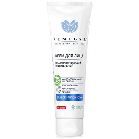 «Средство косметическое по уходу за кожей FEMEGYL КРЕМ для лица Восстанавливающий и питательный подходит для всех типов кожи, восстанавливает и нормализует физиологические внутриклеточные процессы, оказывает питательное, увлажняющее и антиоксидантное действие. Насыщенный ингредиентный состав способствует укреплению внеклеточного матрикса. Обладает плотной текстурой. Без отдушек, без красителей, без парабенов, без спирта, без формальдегида. Крем насыщает питательными веществами, увеличивает синтез основных компонентов матрикса. Оказывает увлажняющее и противовоспалительное действие, обладает регенерирующими и антиоксидантными свойствами благодаря маслу арганы.»