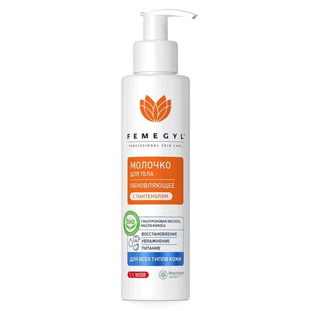 Средство косметическое по уходу за кожей FEMEGYL Молочко «Обновляющее» с пантенолом для тела обеспечивает комплексное увлажнение и защиту кожи. Подходит для всех типов кожи. Средство косметическое по уходу за кожей FEMEGYL Молочко «Обновляющее» с пантенолом для тела оказывает увлажняющее, восстанавливающее действия, защищает и питает кожу. Идеально подготавливает кожу к дальнейшим процедурам. Без отдушек, без красителей, без парабенов, без спирта, без формальдегида.