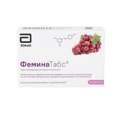 Негормональная поддержка женского здоровья, в том числе в период менопаузы, за счет комплекса фитоэстрогена природного происхождения и антиоксидантов ФеминаТабс® — специально разработанная для женщин биологически активная добавка к пище, представляет собой источник ресвератрола, дополнительный источник витаминов D3 и Е. Входящие в состав компоненты могут оказывать влияние на состояние женщин в период климакса. Благодаря особой технологии сублингвальной доставки компонентов (SUBLINGUAL NANOTABLET TECHNOLOGY©) таблетки ФеминаТабс® быстро растворяются и всасываются в ротовой полости. Такой способ применения позволяет избежать частичного разрушения биологически активных веществ за счет эффекта первичного прохождения через печень и, таким образом, обеспечивает более высокое и быстрое всасывание биологически активных компонентов. Свойства компонентов ФеминаТабс® Ресвератрол Ресвератрол — фитоэстроген природного происхождения, проявляет эффекты, подобные действию собственных эстрогенов женского организма, которые способствуют уменьшению проявлений климактерического синдрома и снижению потенциальных рисков последствий климакса. Ресвератрол существует в двух изоформах: цис- и транс-ресвератрол. ФеминаТабс® содержит транс-ресвератрол, который лучше и быстрее всасывается и, в сравнении с другими фитоэстрогенами, способен связываться cо всеми видами эстрогеновых рецепторов (как с β-, так и с α-), что позволяет оказывать полный спектр эстрогеноподобных эффектов. В литературе имеются сведения, что при применении в течение 3 месяцев биологически активный комплекс транс-ресвератрола с витаминами D3 и Е способствовал снижению частоты и выраженности ряда проявлений климакса у женщин в климактерическом периоде: приливов и ночной потливости, приступов тахикардии, расстройства сна, перепадов настроения и раздражительности, боли в суставах и мышцах. Кроме того, имеются данные о позитивной динамике в коррекции либидо и сексуальной функции на фоне приема такого комплекса в качестве биологической добавки к пище. Транс-ресвератрол благоприятно влияет на сосудистый кровоток, в том числе в сосудах головного мозга, позволяя сохранить когнитивные функции. Имеются данные о том, что ресвератрол оказывает положительное влияние на плотность костной ткани при длительном применении (12 месяцев и более). Транс-ресвератрол — мощный антиоксидант, способствует защите организма от влияния свободных радикалов и перекисного окисления липидов. Способствует сохранению в тканях коллагена, эластина и гиалуроновой кислоты, благодаря чему препятствует возрастным изменениям кожи, увлажняя и сохраняя её эластичность и упругость. Витамин Е Витамин Е является естественным антиоксидантом и при совместном применении с ресвератролом усиливает его антиоксидантный эффект. Применение витамина Е способствует улучшению состояния кожи, ногтей и волос. Витамин D Витамин D3 необходим для поддержания здоровья костной системы и снижения риска развития остеопороза, а также поддержания мышечной силы, общего тонуса и иммунитета. При гормональных нарушениях, особенно при дефиците эстрогенов в климактерическом периоде, у женщин возникает повышенная потребность в витамине D3.