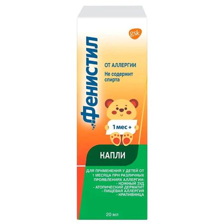 Показания аллергические заболевания (крапивница, сенная лихорадка, круглогодичный аллергический ринит, пищевая и лекарственная аллергия, ангионевротический отек); кожный зуд различного происхождения (экзема, другие зудящие дерматозы /в т.ч. атопический дерматит/, зуд при кори, краснухе, ветряной оспе, укусах насекомых); профилактика аллергических реакций во время проведения гипосенсибилизирующей терапии. Фармакологическое действие Блокатор гистаминовых H1-рецепторов, является конкурентным антагонистом гистамина. Оказывает противоаллергическое и противозудное действие. Снижает повышенную проницаемость капилляров, связанную с аллергическими реакциями. Оказывает также антибрадикининовое и слабое м-холиноблокирующее действие. При приеме препарата днем может отмечаться незначительный седативный эффект. Антигистаминный эффект начинает проявляться через 30 мин после приема внутрь, достигая максимальной выраженности в течение 5 ч. Лекарственное взаимодействие Фенистил® усиливает действие анксиолитиков, снотворных средств и других препаратов, оказывающих угнетающее влияние на ЦНС (опиоидных анальгетиков, противосудорожных препаратов, трициклических антидепрессантов, ингибиторов МАО, антигистаминных средств, противорвотных средств, нейролептиков, скополамина, этанола). Трициклические антидепрессанты и м-холиноблокаторы (в т.ч. бронходилататоры, спазмолитики) увеличивают риск повышения внутриглазного давления или задержки мочи. Необходимо избегать совместного применения антигистаминных средств и прокарбазина.