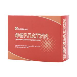Показания к применениюЛечение латентного и клинически выраженного дефицита железа (железодефицитной анемии), профилактика дефицита железа во время беременности, в период лактации, активного роста, при длительных кровотечениях, на фоне неполноценного и несбалансированного питания.Применение при беременности и кормлении грудьюФерлатум показан для профилактики и лечения железодефицитных состояний, развивающихся при беременности и в период лактации (грудного вскармливания).Противопоказания гемохроматоз, нарушения утилизации железа (свинцовая анемия, сидероахрестическая анемия), нежелезодефицитные анемии (гемолитическая анемия или мегалобластная анемия, вызванная дефицитом витамина B12), хронический панкреатит, цирроз печени, повышенная чувствительность к компонентам препарата.Побочное действиеСо стороны пищеварительной системы: возможны (чаще при использовании препарата в повышенных дозах) диарея, запор, тошнота, боли в эпигастрии (которые исчезают при снижении дозы или отмене препарата). Пациент должен быть информирован, что при возникновении побочных реакций необходима консультация врача.СоставДействующее вещество: Железа протеин сукцинилат (iron proteinsuccinylate).Концентрация действующего вещества (мг): 800.Взаимодействие с другими препаратамиПри одновременном применении Ферлатума с блокаторами гистаминовых H2-рецепторов фармакологическое взаимодействие отсутствует. Хлорамфеникол вызывает отсроченную ответную реакцию на терапию препаратами железа.Фармакокинетическое взаимодействие: при одновременном применении препараты железа нарушают процессы абсорбции тетрациклинов из ЖКТ (следует избегать назначения данной комбинации). Всасывание железа увеличивается при одновременном назначении аскорбиновой кислоты в дозе более 200 мг. Всасывание железа уменьшается при одновременном назначении антацидов.